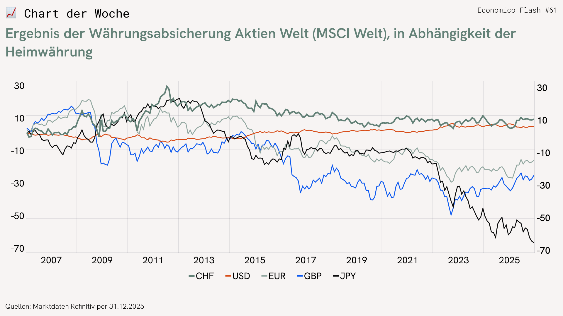 Im Chart der Woche wird der Absicherungsentscheid für ein globales Aktienportfolio (MSCI Welt) aus Sicht verschiedener Heimwährungen – CHF, EUR, GBP, JPY und USD – über die letzten 20 Jahre analysiert. Jede Linie zeigt die Differenz zwischen einem abgesicherten und einem nicht abgesicherten Portfolio.