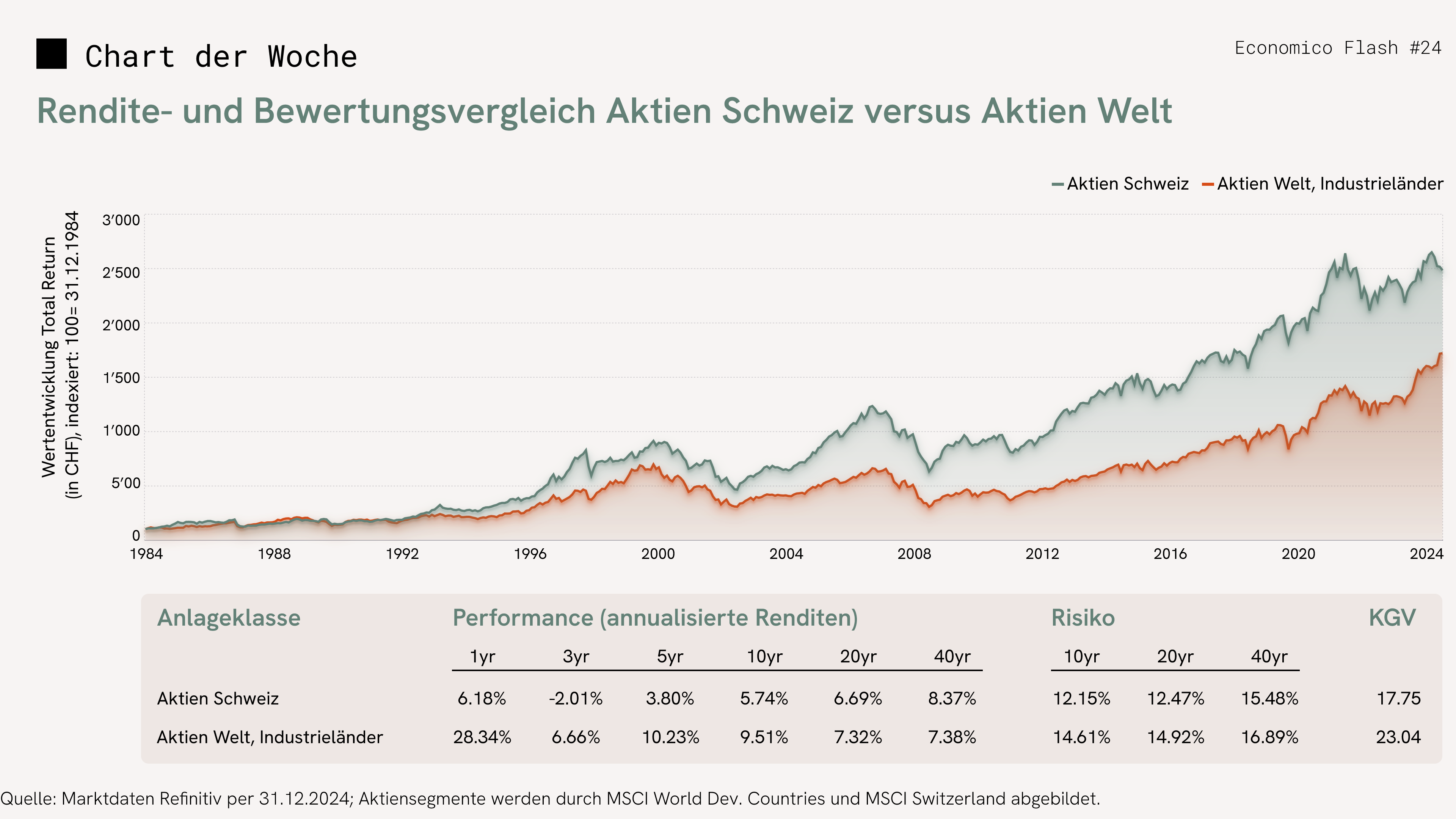 - Die tieferen Kursschwankungen sowie die langfristige Renditebetrachtung sprechen für den Schweizer Aktienmarkt.