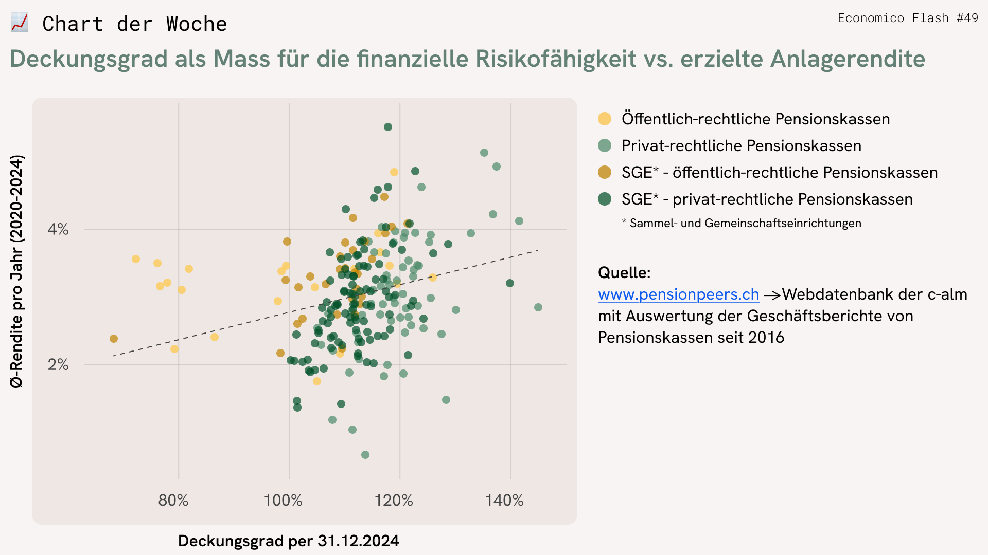 Und tatsächlich scheint es den vermuteten Zusammenhang – im Chart angedeutet durch die steigende Trendlinie – zu geben. Je höher der Deckungsgrad als Mass für die (finanzielle) Risikofähigkeit einer Vorsorgeeinrichtung, desto höher war die Anlagerendite über die Jahre 2020 bis 2024.