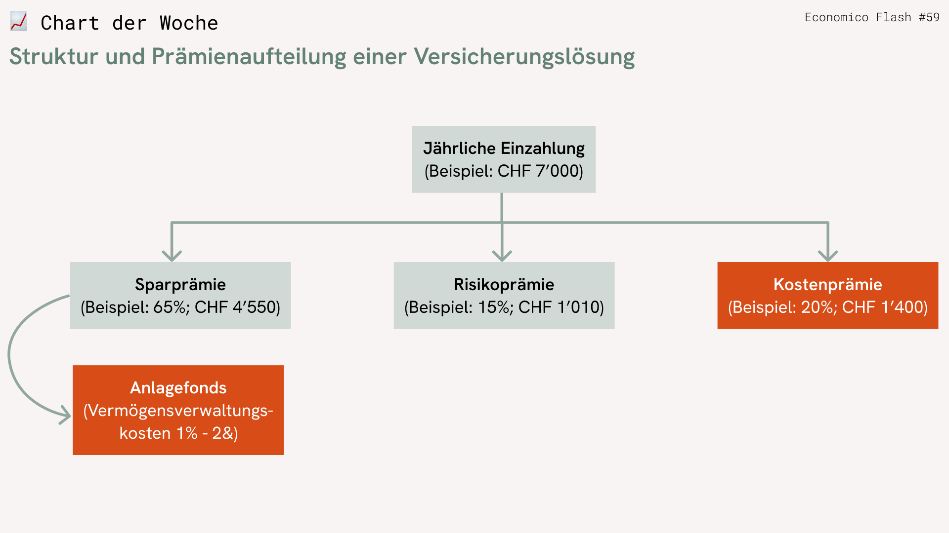 Die im Chart der Woche dargestellten Beispielwerte ergeben sich aus einer typischen Struktur einer Versicherungslösung: Ein Teil der Prämie wird als Sparanteil investiert, ein weiterer Teil dient der Risikoabsicherung und ein signifikanter Anteil entfällt auf Kosten.