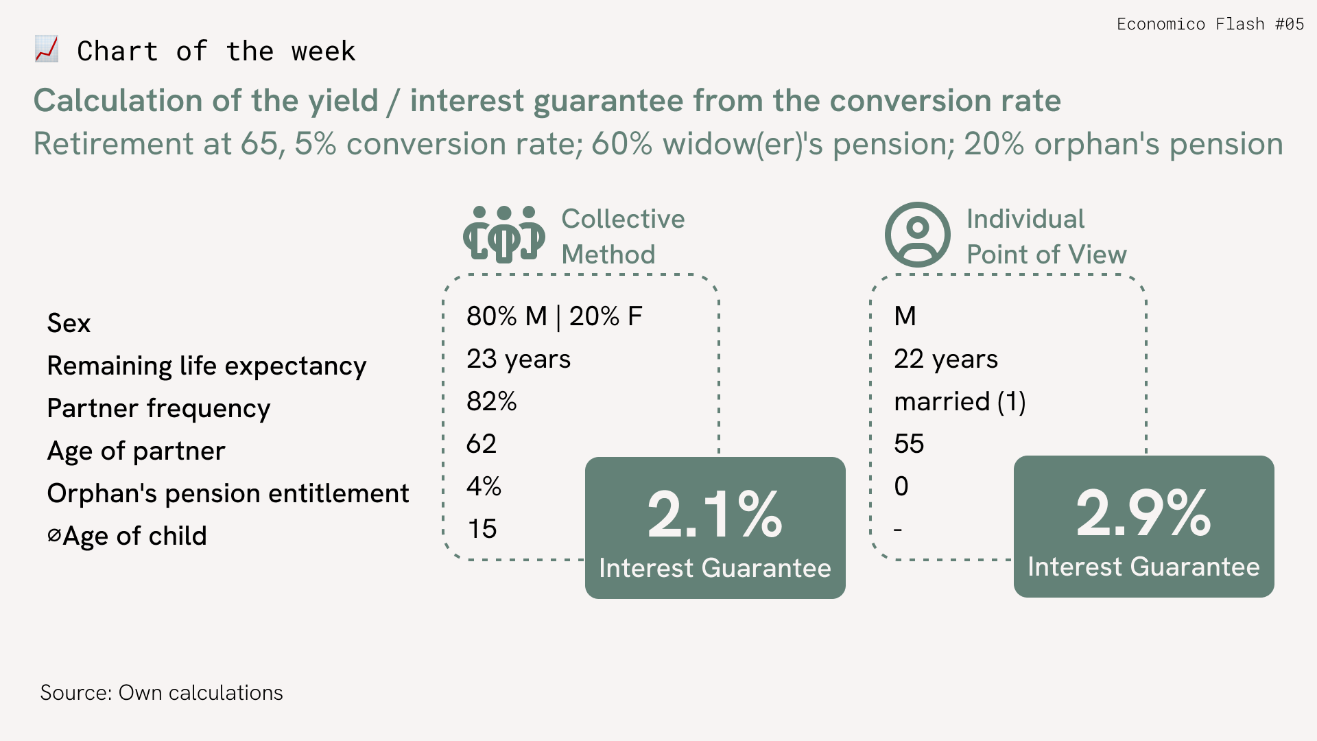 The return on the pension can be implicitly derived from the level of the conversion rate (UWS). Its calculation is based on the consideration of how much return the pension fund must generate annually on the retirement assets available at the time of retirement in order to finance the pension payments until the (on average expected) end of your life and the survivors who are also insured through the retirement pension. This calculation is based on the general principles of life expectancy. Some people die a little earlier, others live a little longer, but on average the calculation works out for the pension fund, which has a large number of insured persons. Using this collective calculation method, it can be calculated that the return or interest guarantee at a conversion rate of 5.0% corresponds to around 2.1%.